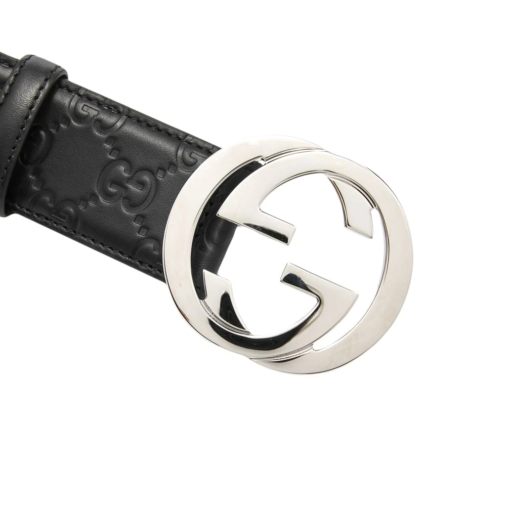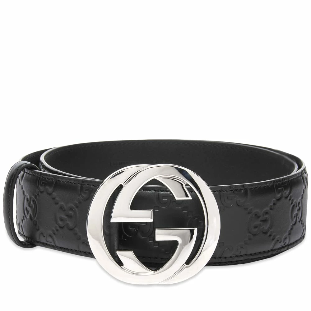 Add Gucci style to any look with this slick leather belt. It’s styled in black with embossed branding throughout and a silver-toned metal buckle to finish.