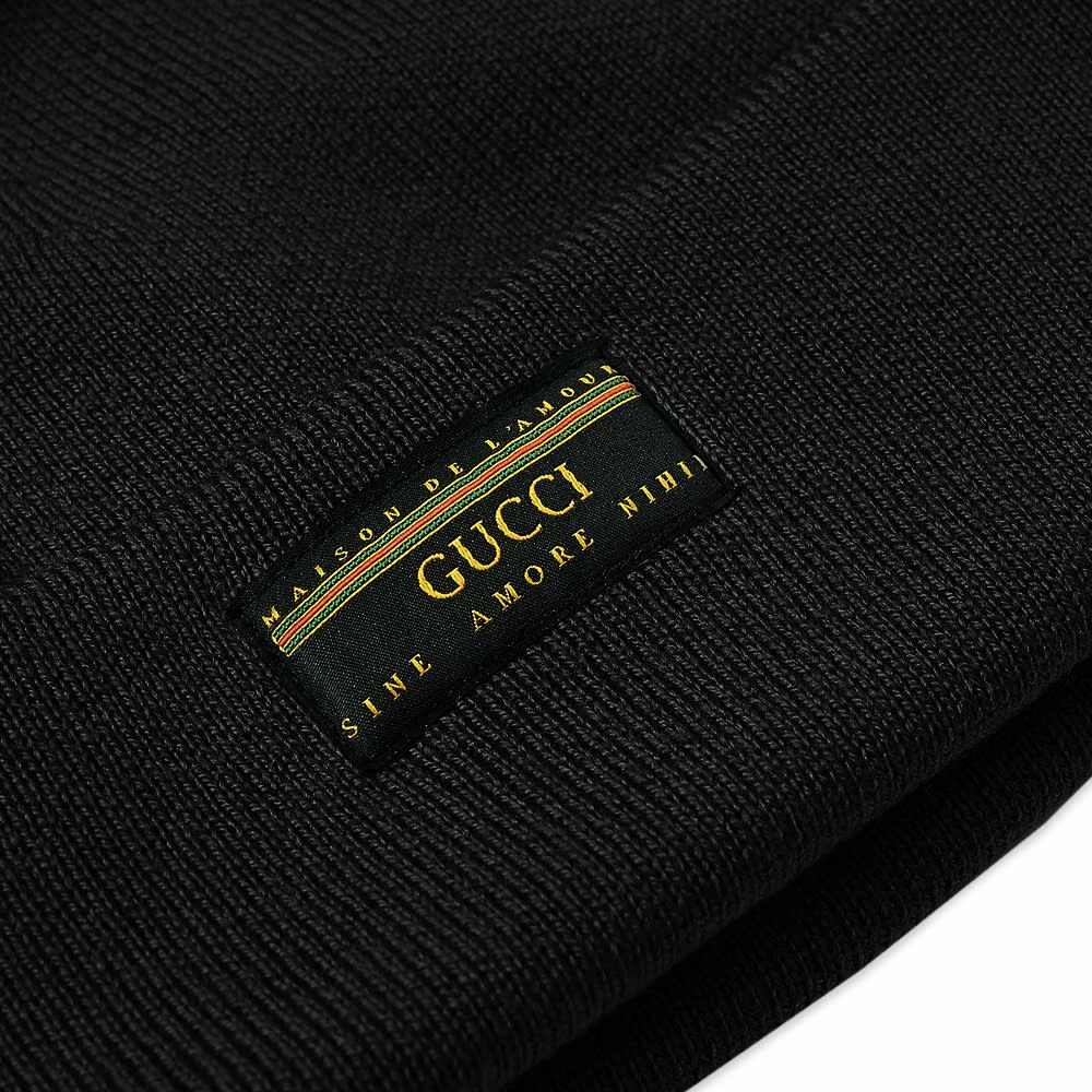 Gucci blends Latin and French influences on this beanie’s jacquard brand patch, inscribing love-themed mottos alongside two-tone stripe and golden letter signatures. It’s crafted in Italy from luxurious black wool and styled with a classic upturned brim.