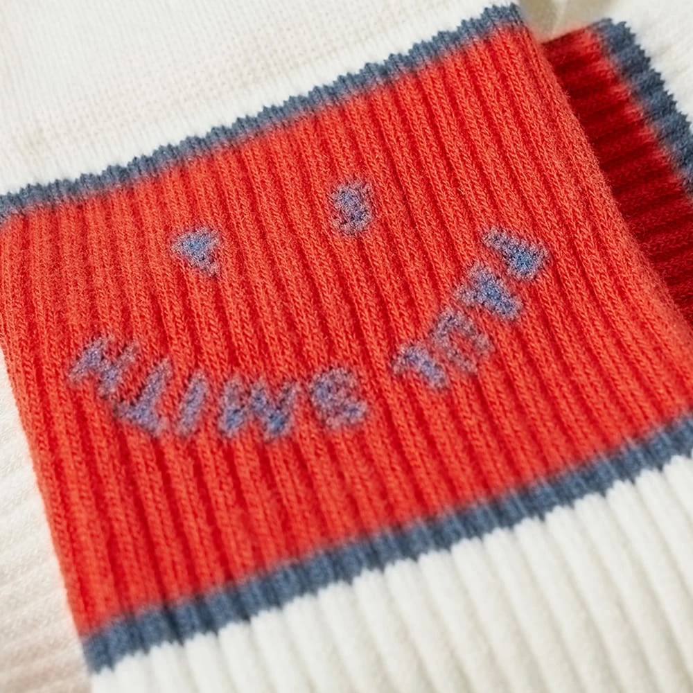 Detailed with Paul Smith’s smiley-faced branding, these white colour block socks guarantee to add a playful touch to your look. They’re crafted from a soft cotton-blend with vibrant red and blue accents and feature fine ribbed detailing for a comfy, snug fit.