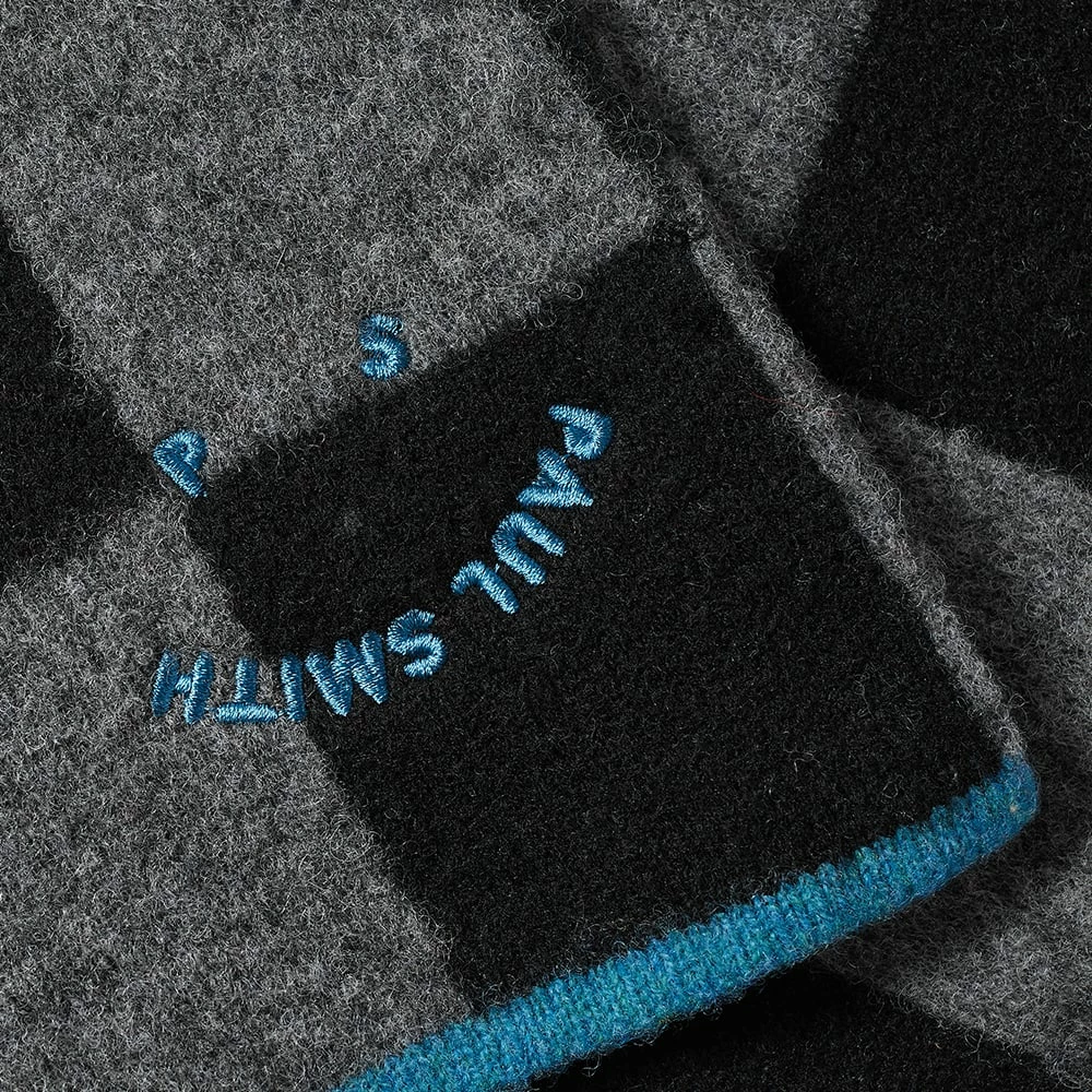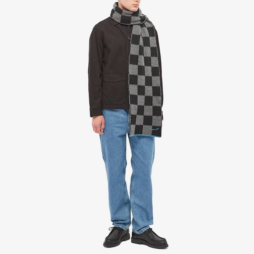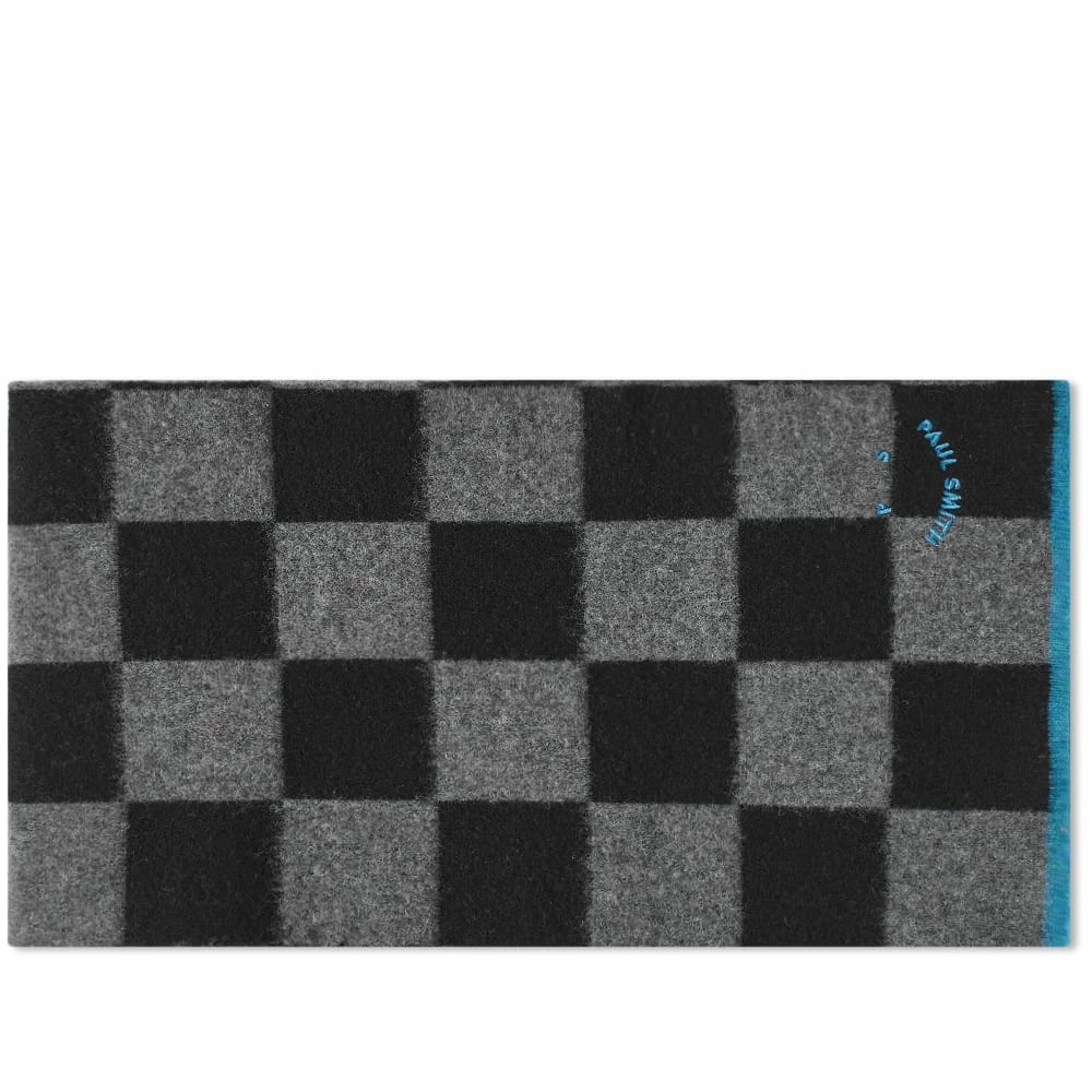 Wrap up and stay warm in this scarf from Paul Smith. Crafted from premium lambswool, it shows off a black and grey checkerboard design and is signed off with a vibrant blue smiley logo at the front.