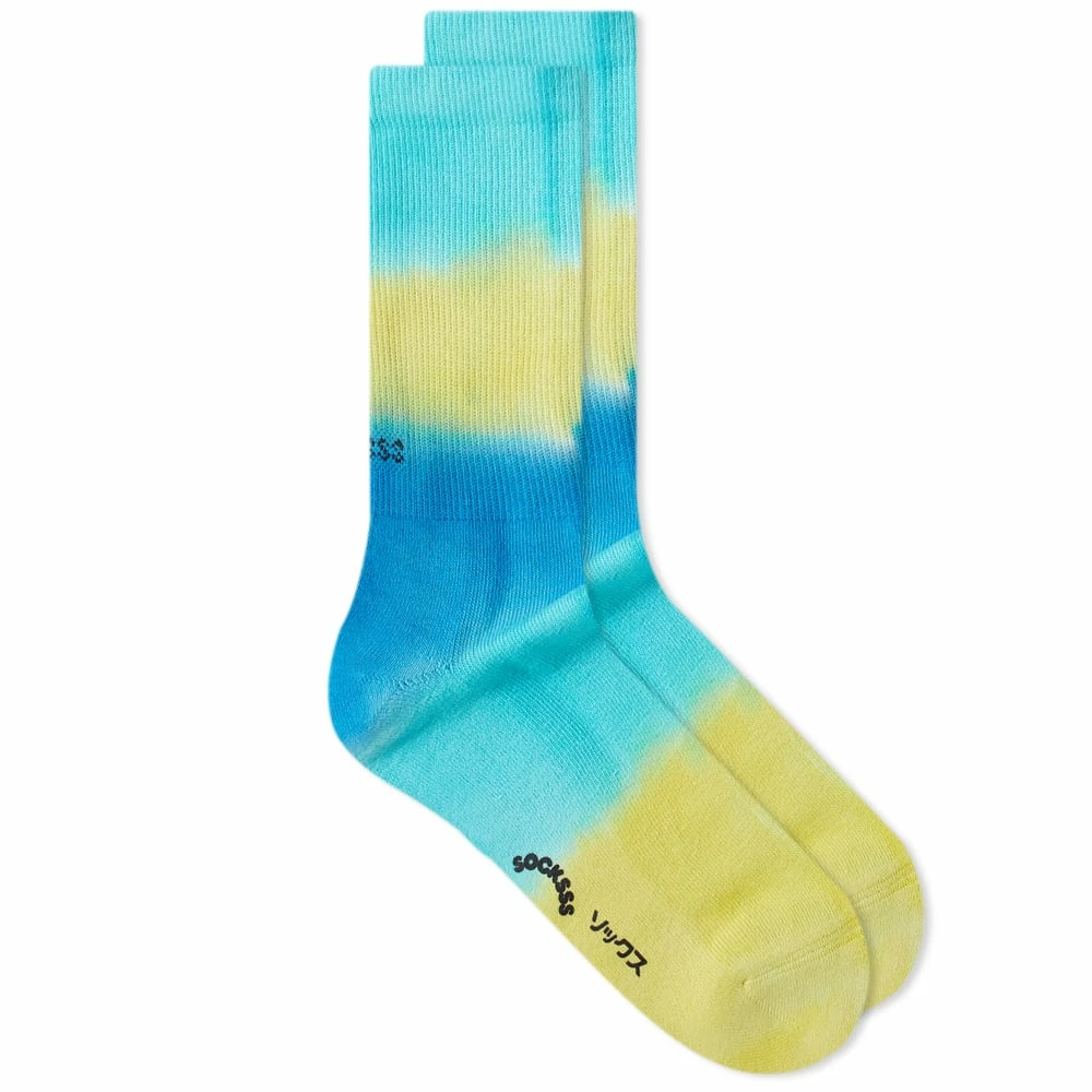 SOCKSSS isn’t shy when it comes to bold colours and prints- and these socks showcase that. Made in Portugal from a soft organic cotton blend, they’re dip-dyed in a yellow and blue hue with bold black branding at the heel.