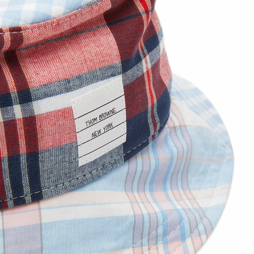 Hinting at the season ahead, Thom Browne shows off its fun side with this bucket hat, a more pastel-toned take on its instantly recognised preppy design codes. Mismatched Madras check panels compliment each other and a signature name tag applique and grosgrain loop finish off this playful piece.